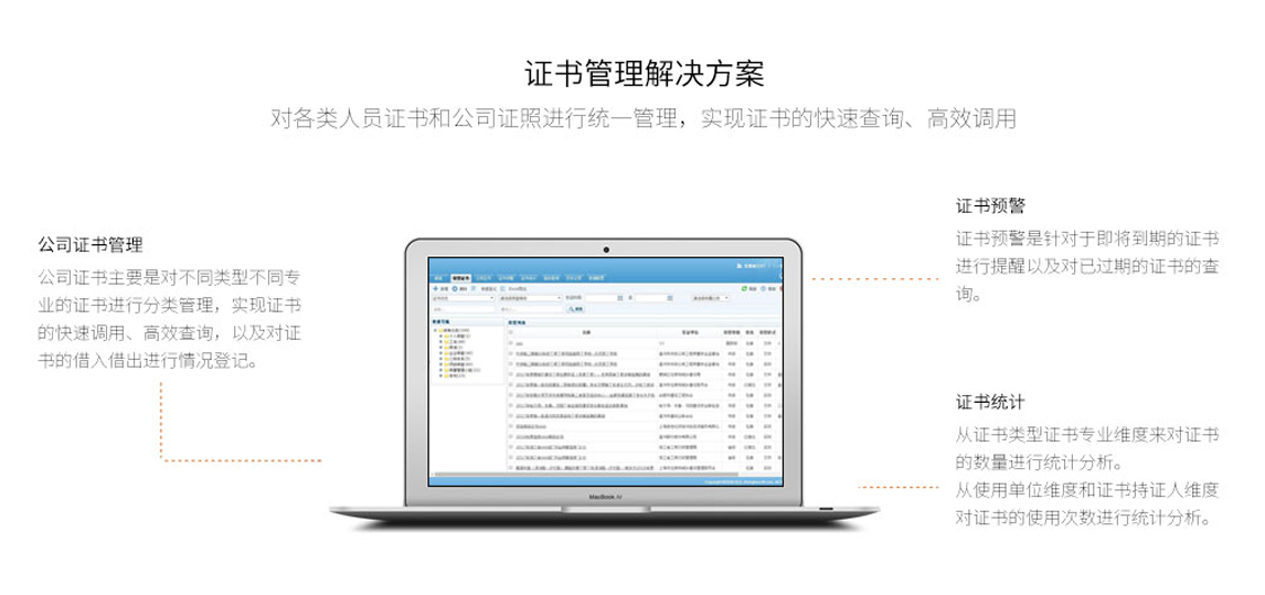 证书管理:完成对各项目证书信息的录入与维护。准确记录证件及持件人信息、证书到期时间、使用记录、费用记录等,分类管控,快速调用,高效查询。